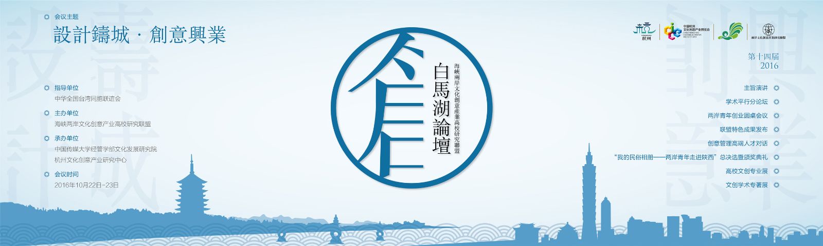 2016年10月22日,第十四届海峡两岸文化创意产业高校研究联盟论坛在杭州白马湖建国饭店召开。本届论坛由中华全国台湾同胞联谊会、中国宋庆龄基金会指导,中国传媒大学文化发展研究院与杭州市文化创意产业研究中心共同承办。多所高校、科研机构、行业协会及文化创意企业的百余位代表参加了此次论坛。 海峡两岸文化创意产业高校研究联盟立足于两岸高校的学术研究与实践交流合作,以务实的理论探讨、学术交流和政产学研对话为基础,开展一系列主题活动,旨在促进全球华人文化创意领域的跨界合作与交流。南京航空航天大学作为联盟成员之一,由星空体育